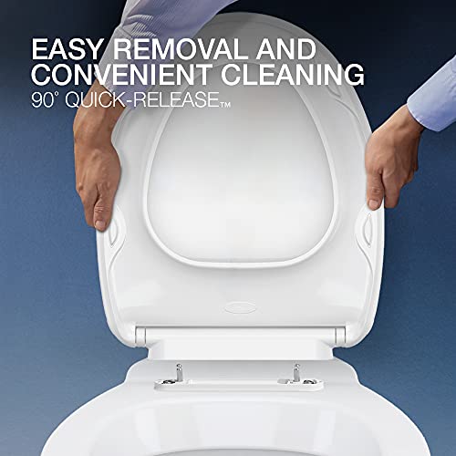 QUICK-RELEASE hinges allow seat to be unlatched from toilet for easy removal and convenient cleaning; no tools required.