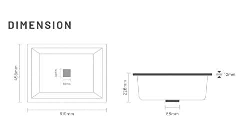 SINK DIMENSION: Overall Size – 610 x 460 mm / 24 x 18 *inch, Bowl Size – 540 x 390 mm / 21 x 15 *inch, Depth – 225 mm / 9 *inch, Thickness – 12 mm (Horizontal Surfaces), 10 mm (Vertical Surfaces)